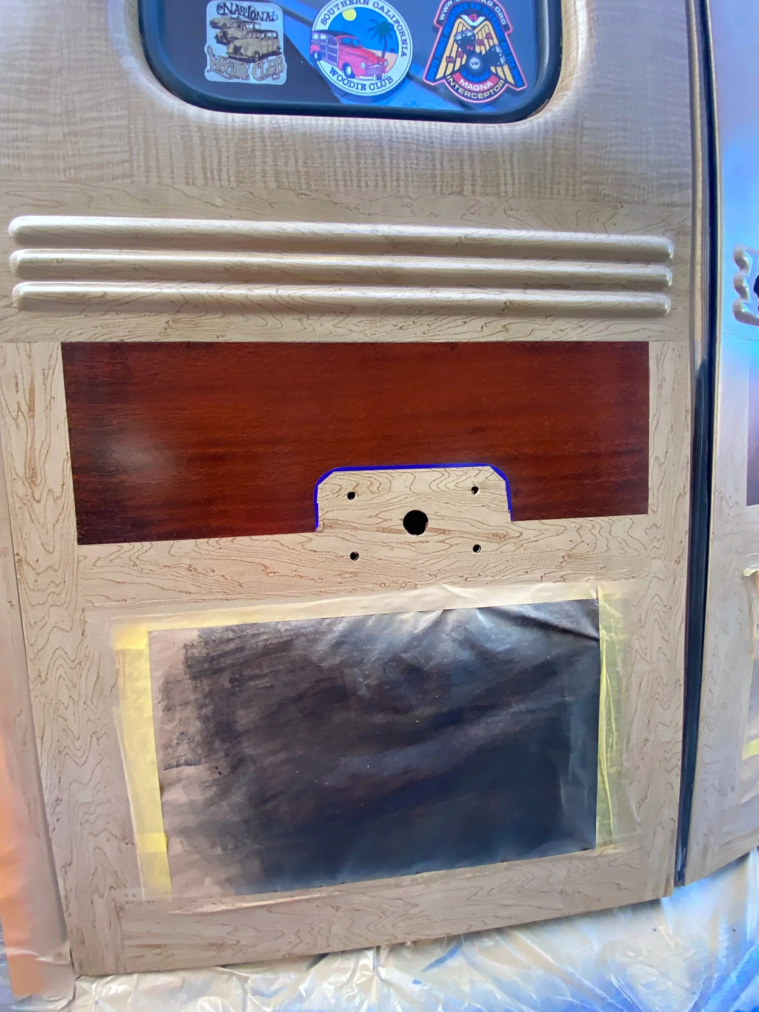 After the body work a surface prep, I applied base coat paint —maple for the frames and mahogany for the panels. I then applied Birds Eye Maple grain pattern for the frames and Oriental Mahogany or Teak on the panels. Over the whole thing is a urethane clear coat for a deep gloss.